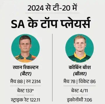 साउथ अफ्रीका के कप्तान ऐडन मार्करम ने कनाडा के खिलाफ 32 गेंदों पर 59 रन बनाए थे। वह एक बार फिर टीम को अच्छी शुरुआत दिलाना चाहेंगे। तेज गेंदबाज लुंगी एनगिडी ने उस मैच में 31 रन देकर 4 विकेट लिए थे। वहीं पिछले वर्ल्ड कप के बाद से रायन रिकेल्टन ने टीम के लिए सबसे ज्यादा रन बनाए हैं।