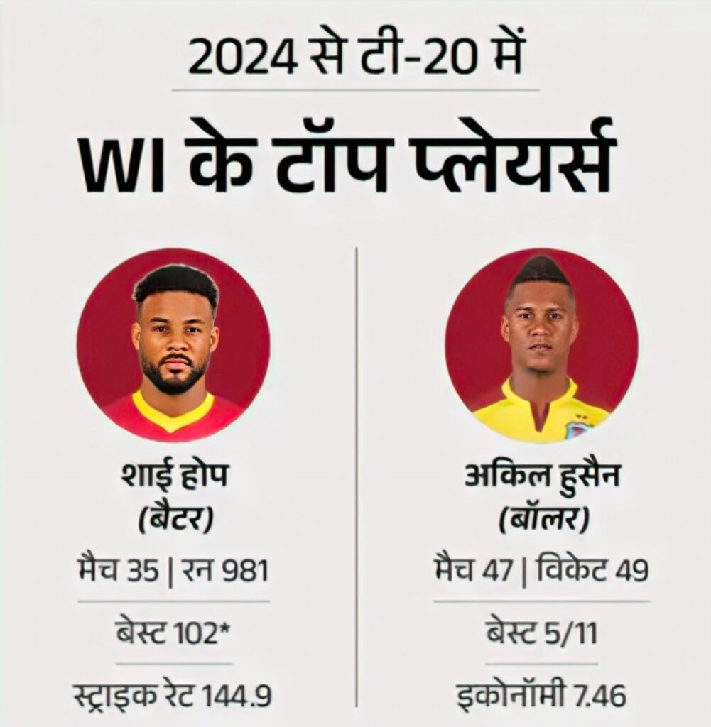 शाई होप वेस्टइंडीज के टॉप स्कोरर वेस्टइंडीज के लिए 2024 के बाद से कप्तान शाई होप ने सबसे ज्यादा 981 रन बनाए हैं। उनके नाम एक सेंचुरी भी है। वहीं गेंदबाजी में लेफ्ट आर्म स्पिनर अकील हुसैन 49 विकेट के साथ टॉप विकेट टेकर हैं। स्कॉटलैंड के खिलाफ पहले मैच में शिमरोन हेटमायर ने फिफ्टी लगाई थी। वहीं रोमारियो शेफर्ड ने हैट्रिक ली थी।
