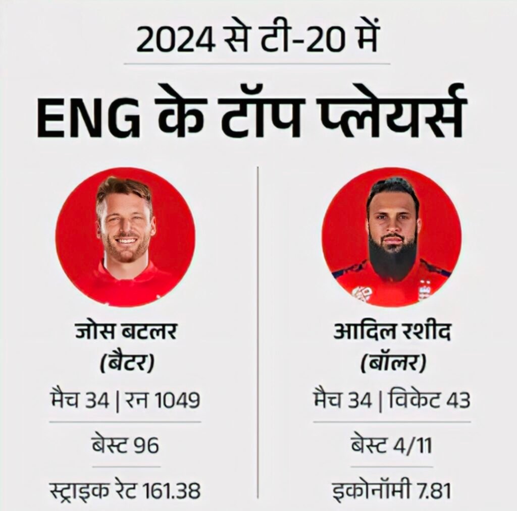 रशीद इंग्लैंड के टॉप विकेट टेकर इंग्लैंड के लिए लेग स्पिनर आदिल रशीद ने 2024 के बाद से सबसे ज्यादा 43 विकेट लिए हैं। हालांकि, नेपाल के खिलाफ पिछले मुकाबले में वे महंगे साबित हुए थे। जहां 3 ही ओवर में उन्होंने 42 रन खर्च कर दिए थे। जोस बटलर 1049 रन बनाकर टीम के टॉप स्कोरर हैं।