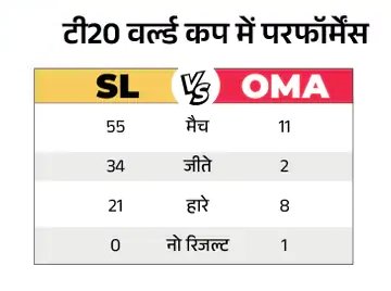 टी-20 इंटरनेशल में श्रीलंका और ओमान पहली बार आपस में भिड़ेंगे। दोनों टीमें 2023 के वनडे वर्ल्ड कप क्वालिफायर में आमने-सामने हुई थीं। तब श्रीलंका ने ओमान को 98 रन पर ऑलआउट कर 10 विकेट से मुकाबला जीत लिया था।टी-20 वर्ल्ड कप के इतिहास में दोनों टीमों की परफॉर्मेंस बिल्कुल उलट रही है। श्रीलंका ने 55 में से 34 मैच जीते हैं, टीम ने 2014 में भारत को फाइनल हराकर टाइटल भी जीता था। वहीं ओमान 11 में से 2 ही मुकाबले जीत पाया।