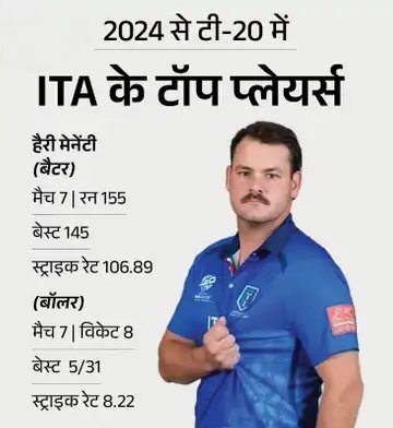 बेन मेनेंटी की फिफ्टी और हैरी मेनेंटी की छोटी पारी के अलावा कोई भी बल्लेबाज प्रभाव नहीं छोड़ सका। 2024 टी-20 वर्ल्ड कप के बाद से हैरी मेनेंटी इटली के टॉप रन-स्कोरर हैं। उन्होंने 7 मैचों में 106.89 की स्ट्राइक रेट से 155 रन बनाए हैं। साथ ही गेंदबाजी में 8.22 की इकोनॉमी से 8 विकेट भी लिए हैं।