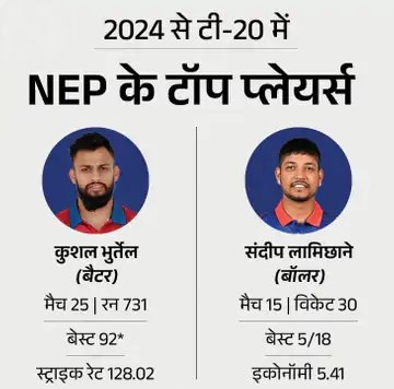 गेंदबाजी में संदीप लामिछाने शानदार फॉर्म में हैं। 2024 टी-20 वर्ल्ड कप के बाद से 15 मैचों में 5.41 की इकोनॉमी से 30 विकेट ले चुके हैं।