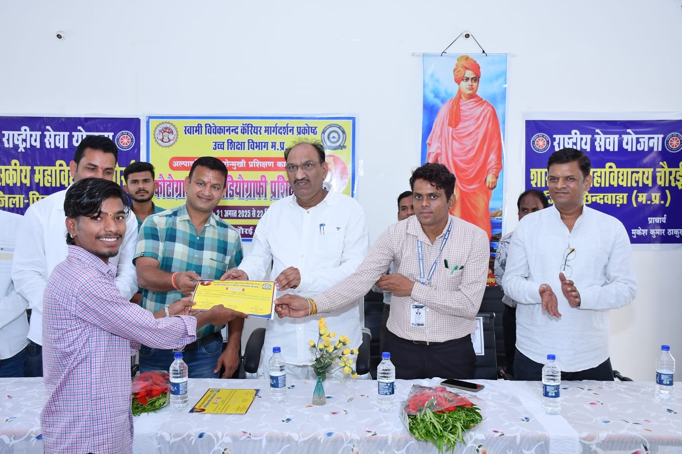 शासकीय महाविद्यालय चौरई में बुधवार को स्वामी विवेकानंद कैरियर मार्गदर्शन प्रकोष्ठ के अंतर्गत उच्च शिक्षा विभाग के निर्देषानुसार अल्पअवधि स्वरोजगार विषय फोटाग्राफी एंव वीडियोग्राफी प्रशिक्षण के समापन एंव प्रमाण-पत्र वितरण का कार्यक्रम सम्पन्न हुआ। कार्यक्रम के मुख्य अतिथि विद्यायक चौधरी सुजीत सिंह, विशिष्ट अतिथि प्रेमेंद्र साहू व धीरज खण्डेलवाल की।प्रमुख उपस्थिति में संपन्न हुआ। कार्यक्रम का शुभारंभ सरस्वती पूजन कर किया गया इसके पश्चात अतिथियों का फूल-माला के साथ स्वागत अभिनंदन किया गया मुख्य अतिथि श्री चौधरी ने अपने उद्बोधन में समस्त छात्र-छात्राओं को भविष्य स्वरोजगार से उधगृहत असीम संभावनाओं को बताते हुए प्रोत्साहित किया एंव महाविद्यालय में अध्ययन के दौरान छात्र जीवन में लक्ष्य को निर्धारित करते हुए अध्यापन कार्य को प्राथमिकता के साथ अपने कार्यो का निर्वहन करे।