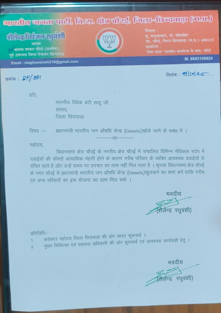 चौरई : महंगाई से जूझ रहे आमजन के लिए जरूरी है कि क्षेत्र में जल्द ही प्रधानमंत्री जन औषधि केंद्र खुले जिससे की गरीबों को कम दामों में दवाईयां उपलब्ध हो सके । गुरुवार को पूर्व जिला पंचायत उपाध्यक्ष एवं ग्रामीण मंडल अध्यक्ष शैलेन्द्र बब्लू पटेल ने उप मुख्यमंत्री एवं स्वास्थ्य मंत्री राजेंद्र शुक्ला एवं सांसद विवेक बंटी साहू को पत्र लिख कर जल्द से जल्द क्षेत्र में जन औषधि केंद्र खुलवाने का निवेदन किया, चौरई में औषधि केंद्र के खुलने से लोगो को अन्य दवाओं की तुलना में 50% से 90% सस्ती और गुणवत्तापूर्ण जेनेरिक दवाएं मिलेगी एवं गरीब और मध्यम वर्ग के लिए स्वास्थ्य खर्च कम होगा साथ ही वंचित क्षेत्रों में दवाओं तक पहुंच बढ़ना और नए रोजगार के अवसर पैदा होना,इसके अतिरिक्त, इन केंद्रों को खोलने वाले उद्यमियों को सरकारी प्रोत्साहन और आर्थिक सहायता भी मिलती है।